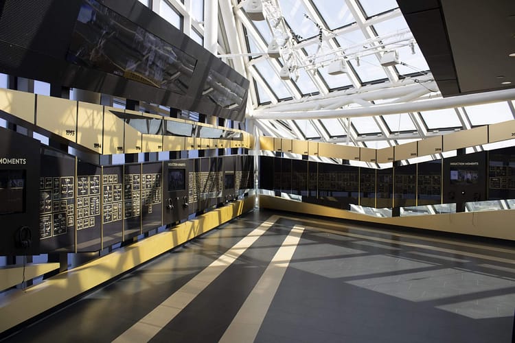 The actual Hall of Fame is upstairs on the third level with an explanation of the categories and the induction process followed by golden names on a black wall for every year since 1983.