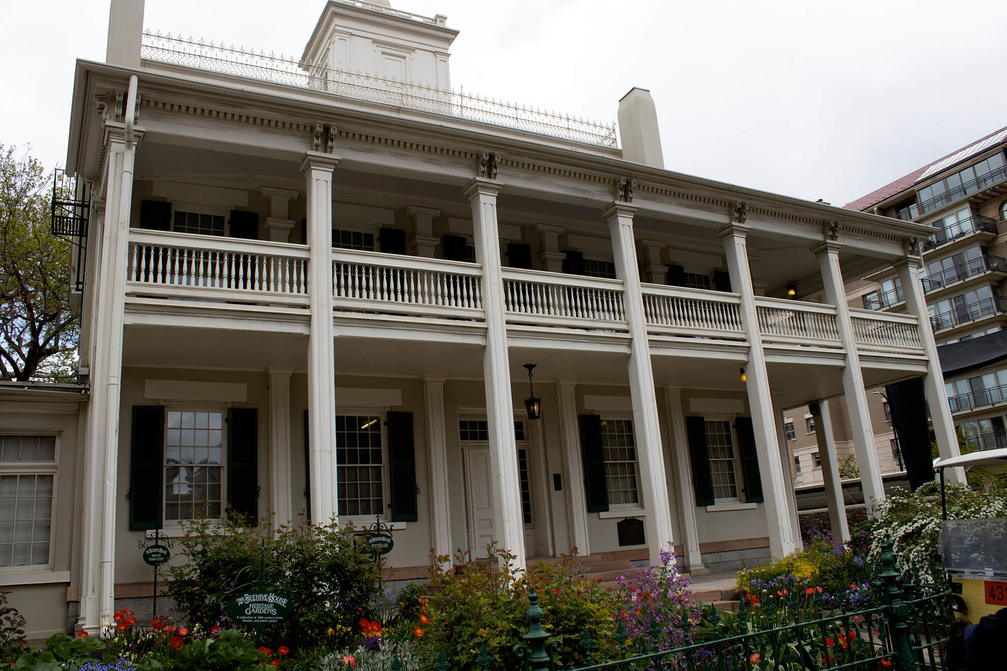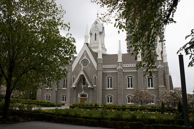 The Beehive House at the end of the block was Brigham Young’s office and home. It’s been restored in the 1960s to look as it did in 1888. Tours are available every half hour to see the interior of the house. It was built with Adobe bricks and soft yellow pine before being plastered and painted to look like a normal house.