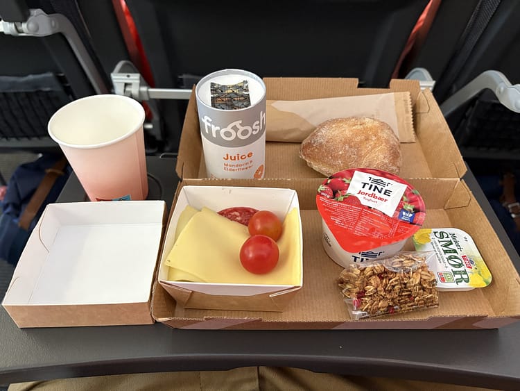 The morning flight includes a breakfast box and drinks. Breakfast consisted of a yoghurt with granola and a warm bread roll with butter, a slice of salami and two slices of yellow cheese. Yes, the Norwegians have gulost and brunost, which translate to yellow cheese and brown cheese. Coffee and tea were free.