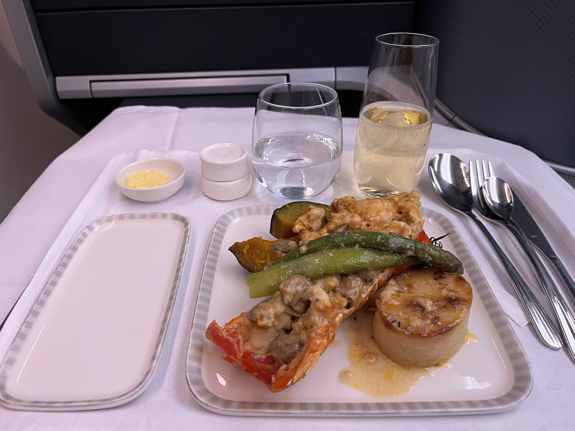 Champagne was served upon boarding. About an hour after takeoff, I got a smoked salmon salad with mango salsa and another glass of champagne for the meal. I booked the cook two weeks in advance online so I could get lobster thermidor in the air. Flights departing from Singapore have up to 42 meal selections for pre-order.