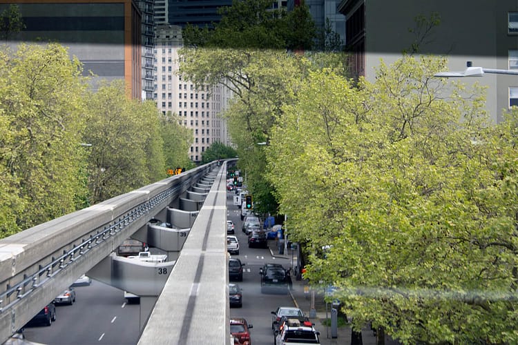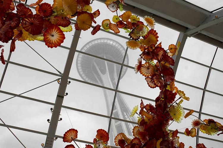 The space needle can be admired from many directions. You can see it when you approach the area by monorail, through the ceiling glass at Chihuly, or sprouting from between the trees downstairs.