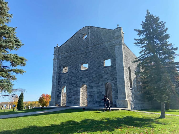 The ruins of a church built in 1815 stand in Glengarry County, Ontario. The empty shell of the stone structure is all that is left after a fire ravaged the church in 1970. A modern church structure stands adjacent to the old one and continues to serve the community today.