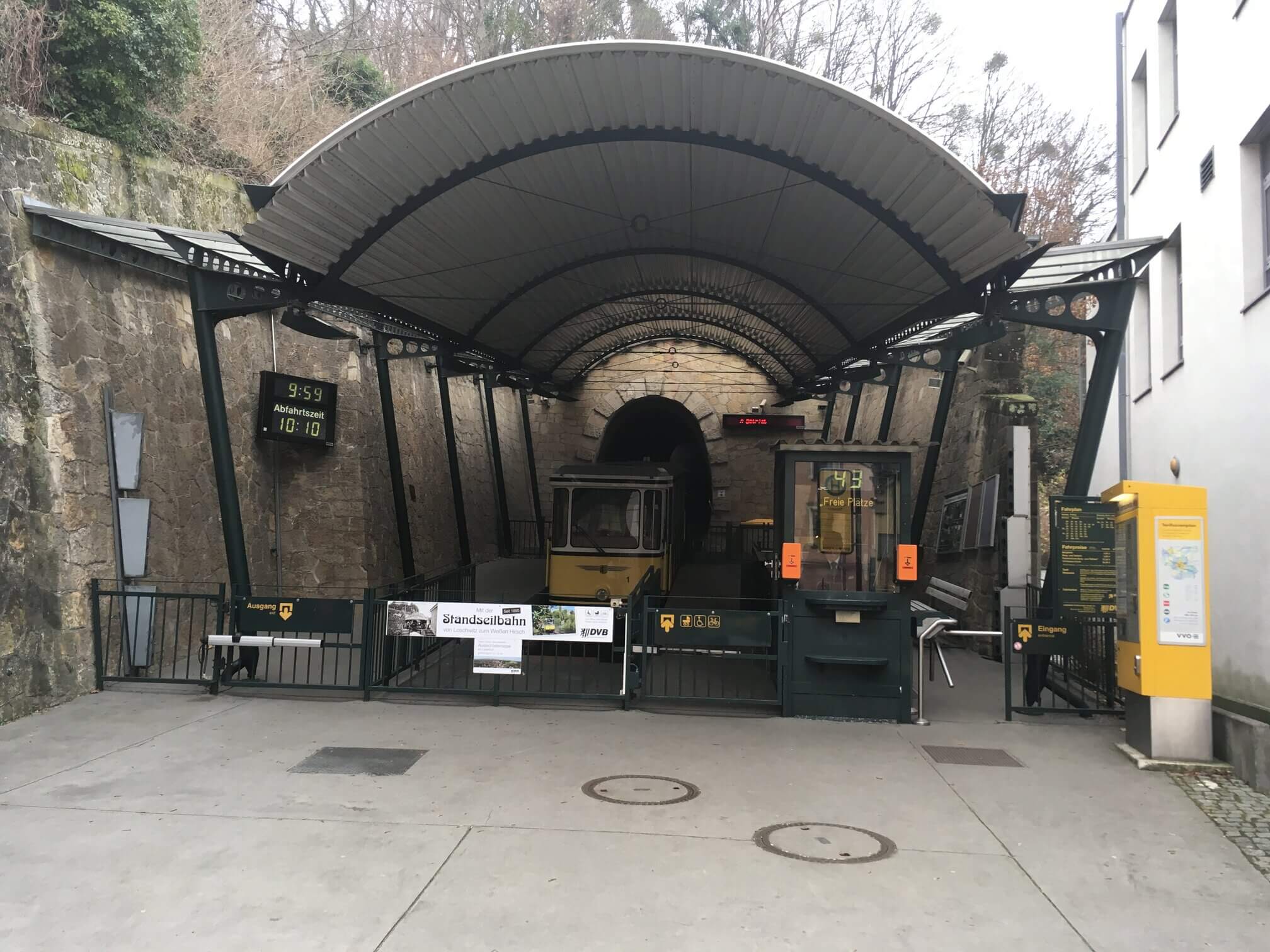 With a maximum incline of 29%, the funicular takes passengers from the bank of the River Elbe to Luisenhof. Its unusual alignment brings it onto a bridge over a valley between two hills. It used to be steam-powered until 1910 when it was electrified. The carriages were refurbished in 2014 to its current appearance.