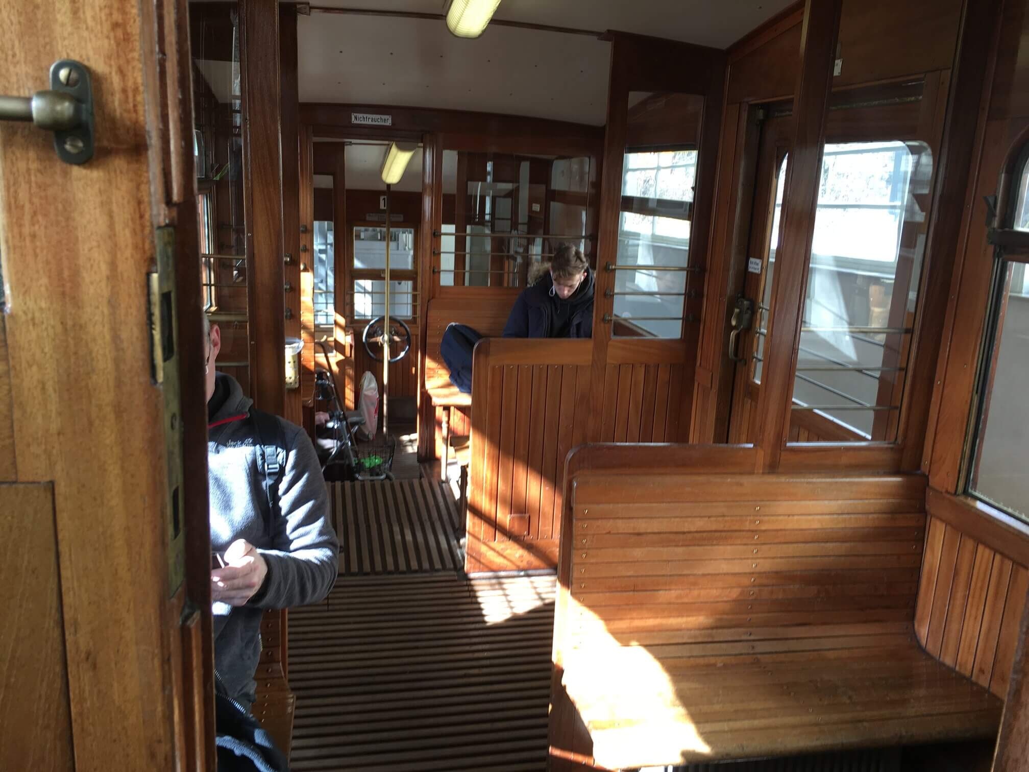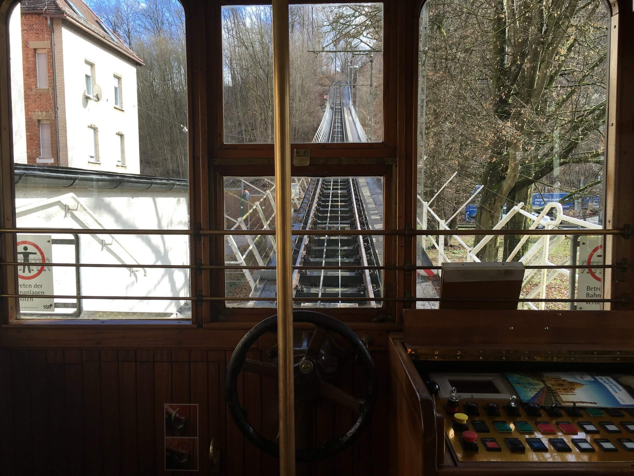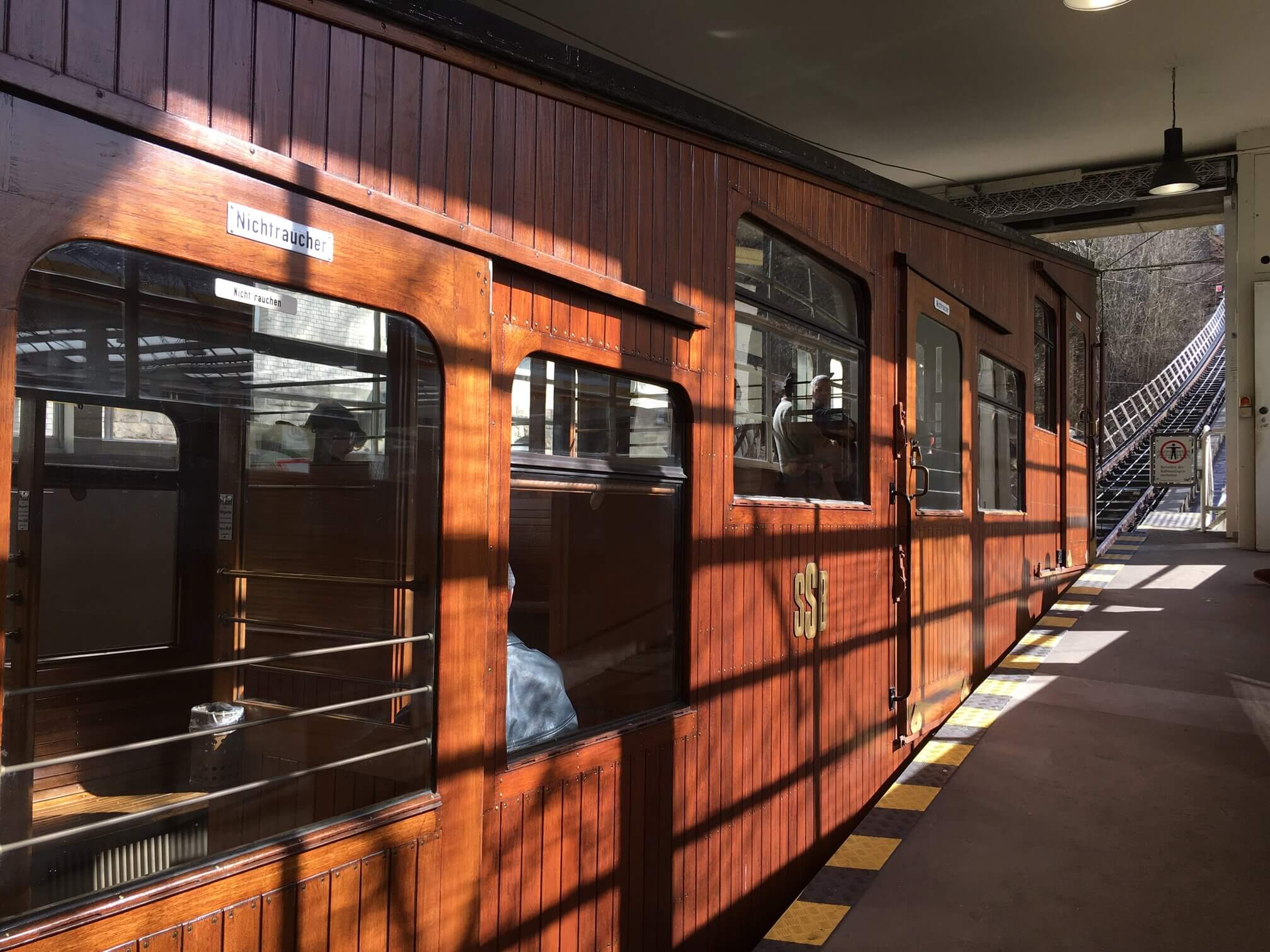 The two cars on the Standseilbahn are original from when the line first opened in 1929. The pair of teak trains are pulled by cable along the whole 536 metres of track with a pass-through at the midpoint. It was built to transport visitors up to the cemetery 90 metres above the city. The funicular takes passengers 87 metres of the way and they have to walk the last three metres.