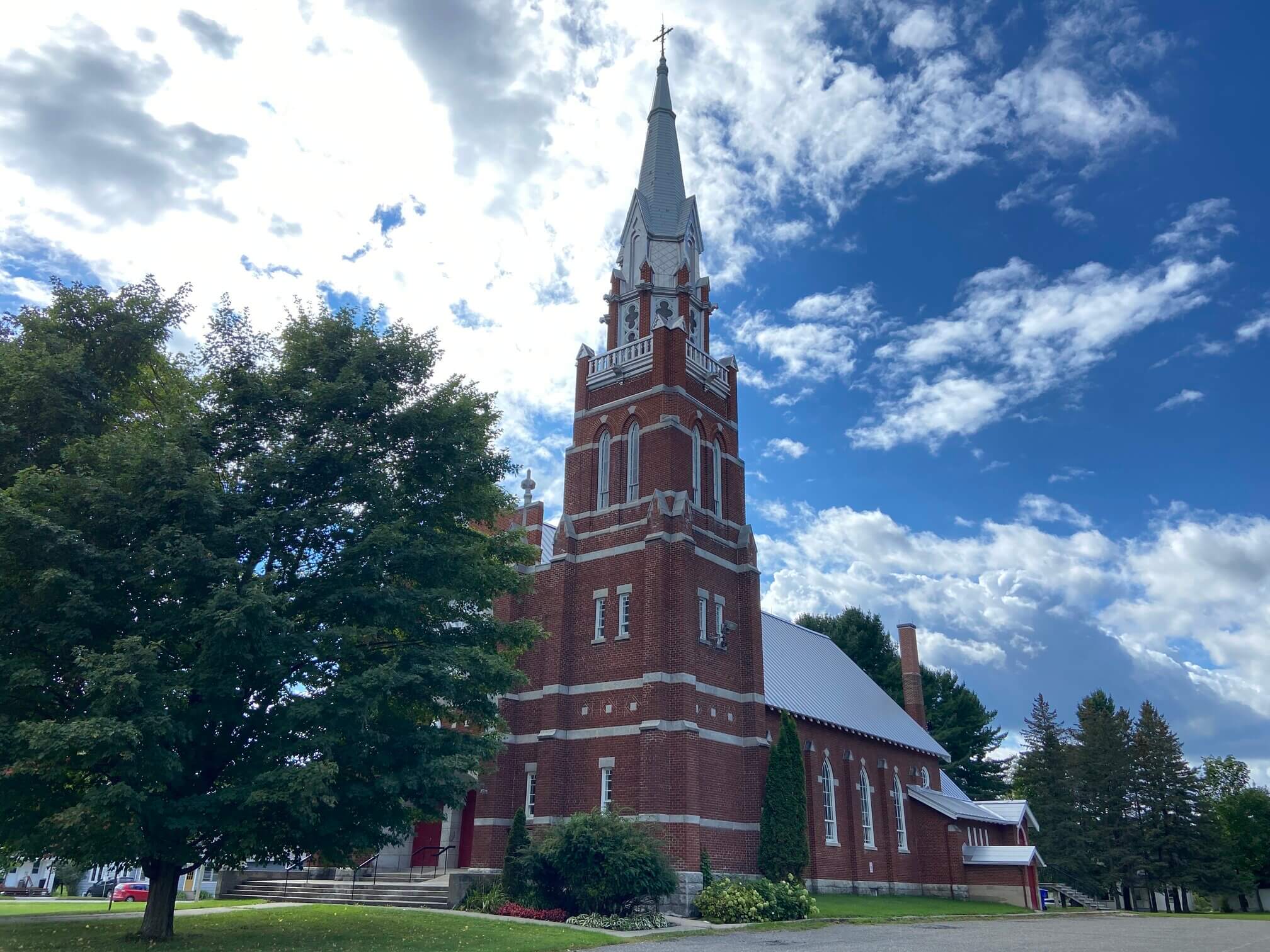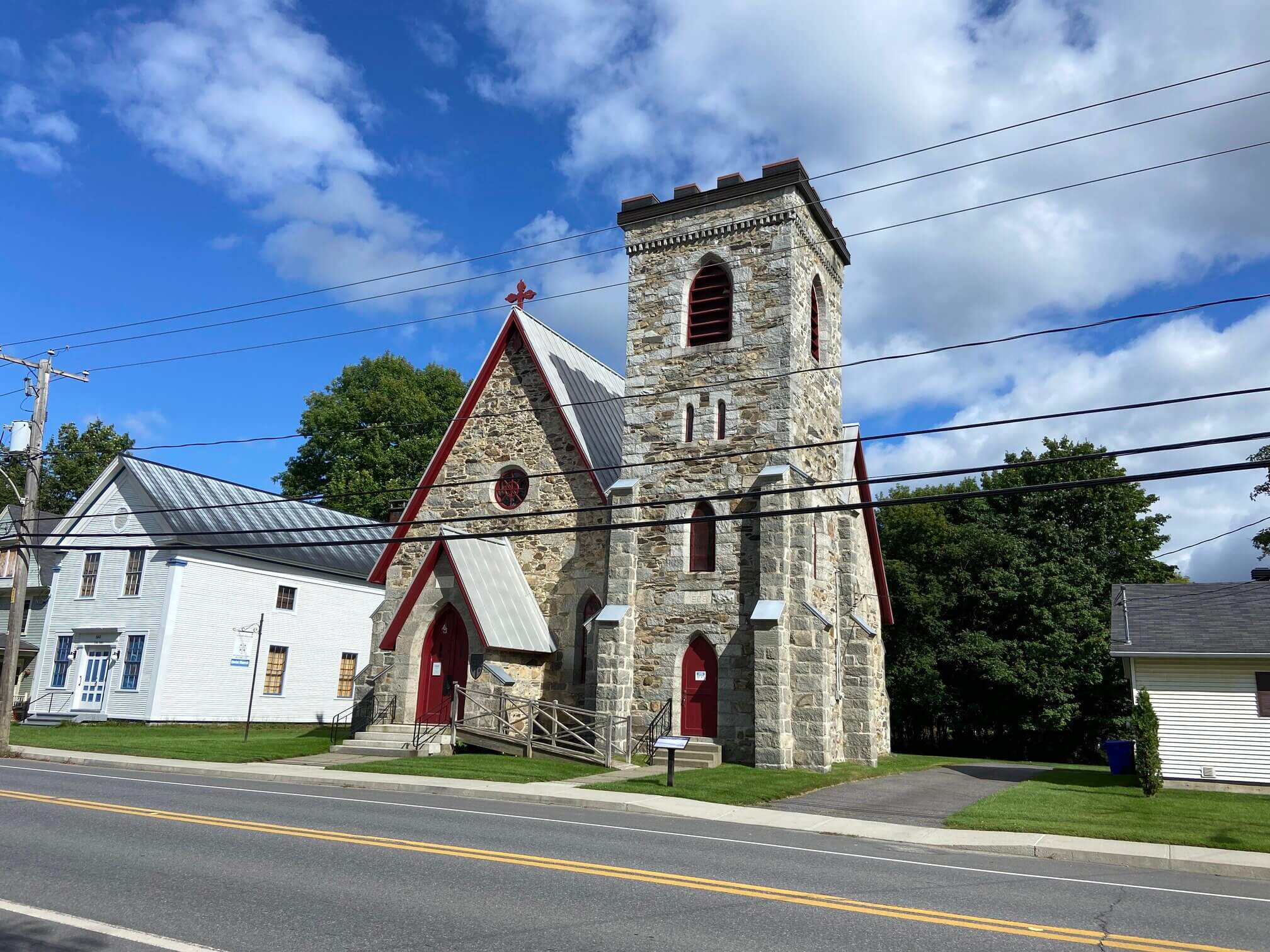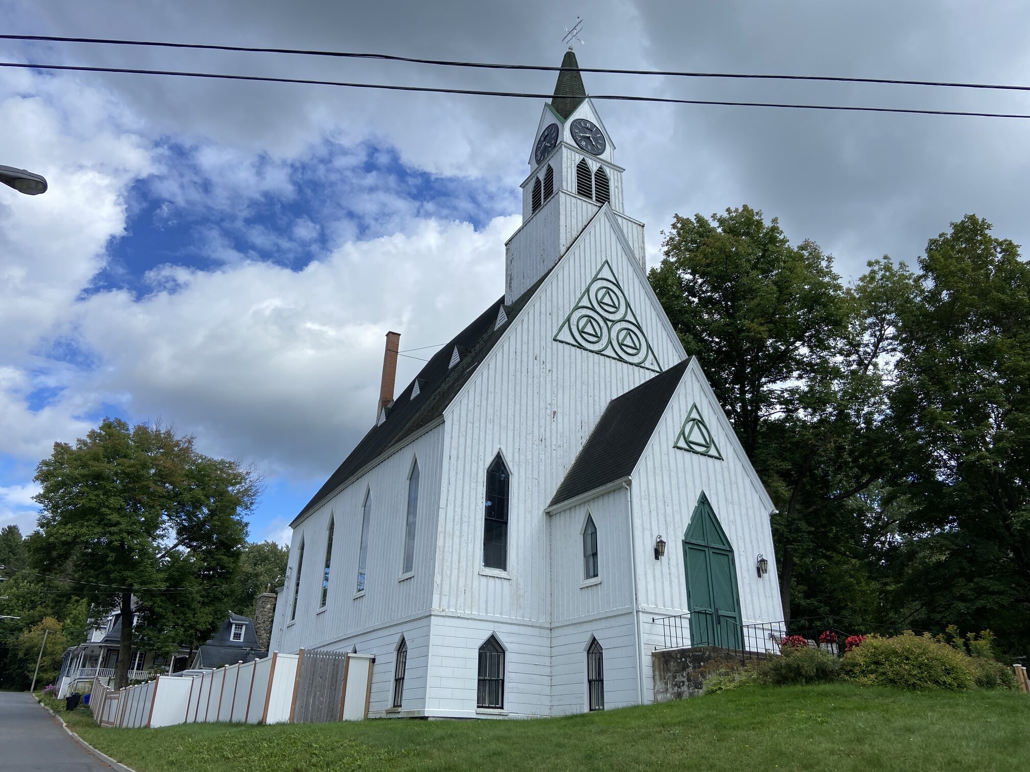 Apart from an odd public building, Stanstead also has several historic churches. The Stanstead United Church is just behind the library on the Canadian side of the community. This former Congregationalist service began in 1810 and residents from both sides of the border attended the same service even during the War of 1812. The church building was constructed in 1876 and the triangular motifs on the façade represent the Holy Trinity.