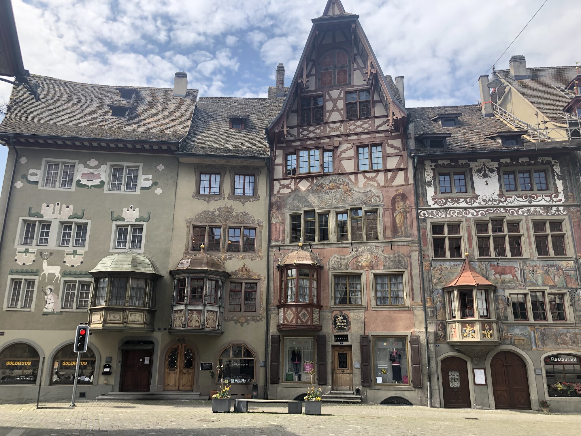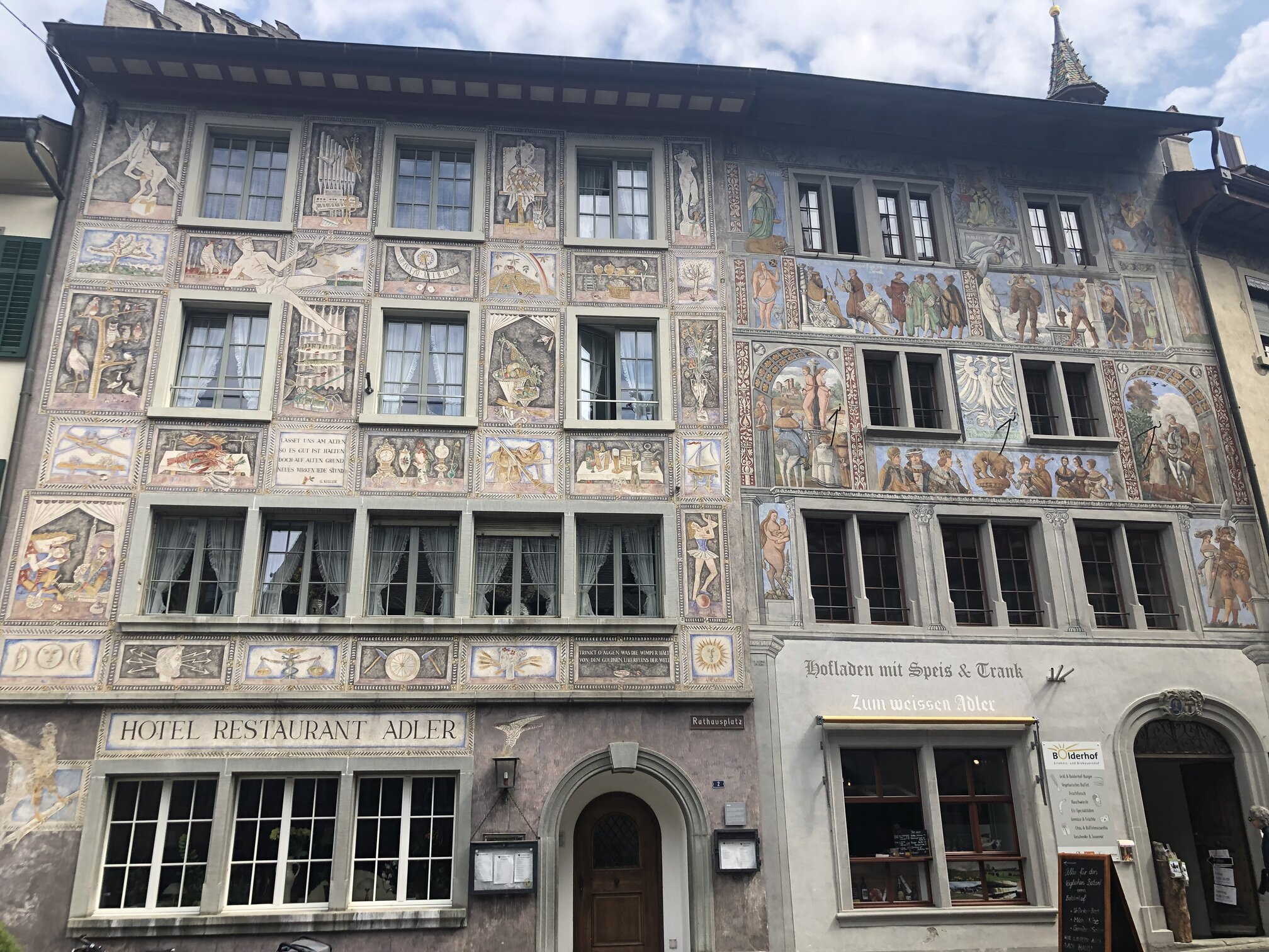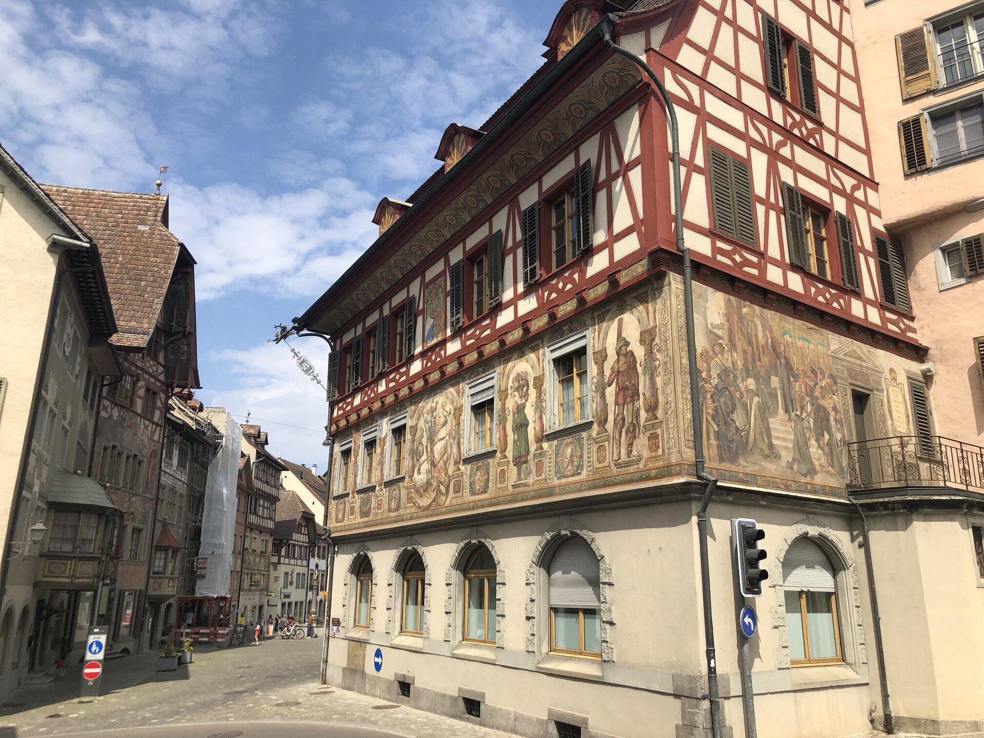 Perhaps Stein am Rhein is the most classically artistic city in Switzerland? It was hundreds of years ahead in time of the Soviet Union, when the Russians included public art in their metro systems the Swiss had already painted the walls around public town squares for two hundred years. I believe many of the paintings feature scenes from the history of the local area or the life of the first owner of the building.