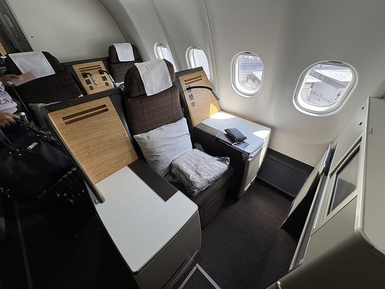 The seat is over a decade old and its age shows. The buttons look tired and there are crumbs stuck in crevasses everywhere. My seat 4A was a single seat at the bulkhead directly behind first class, so it came with a $239 surcharge on top of the ticket price. I get two side tables instead of one and a full-width leg rest. The forward business class mini cabin only has 10 seats and is a nice place to be.