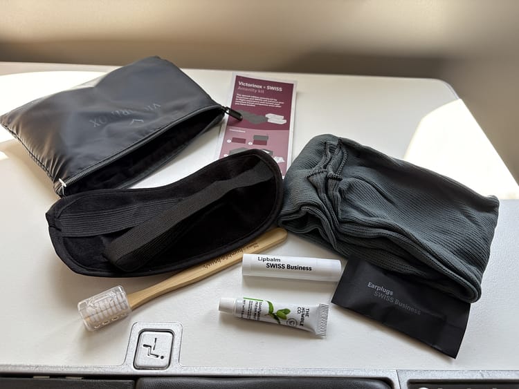 The Victorinox-branded amenity kit included earplugs, an eye mask, socks, lip balm, a toothbrush and toothpaste.
