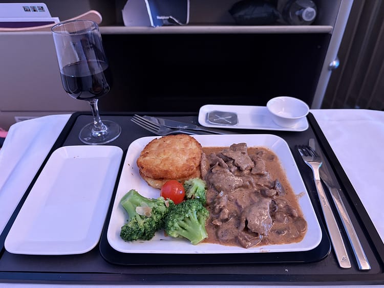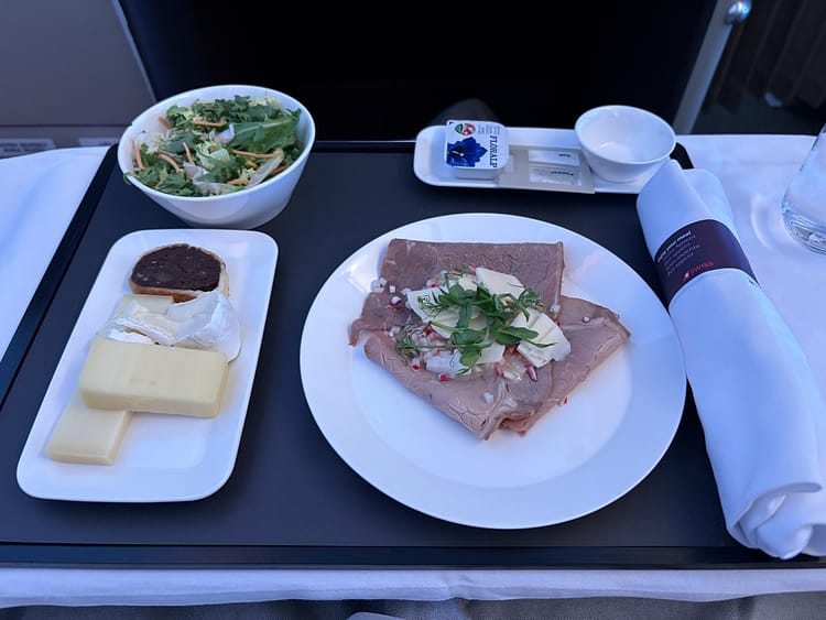 Swiss and its parent company Lufthansa offers meal preordering when flying out of one of their hubs. I had slow-cooked beef as a starter, nibbled on the cheese, and enjoyed the veal and rösti for lunch. The sauce on the real was quite salty, but paired well with the rösti.