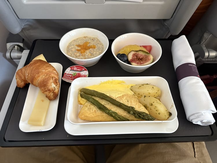 Breakfast was a choice between an omelette or cereal with milk. I naturally chose the hot food option as I woke up at 3 a.m. and hadn’t eaten for four hours by the time breakfast was served. It came with a side of cheese, my choice of pastry, and a fruity quinoa. I ordered an apfelschorle that wasn’t available on the official menu, but a true Swiss will make it for you.