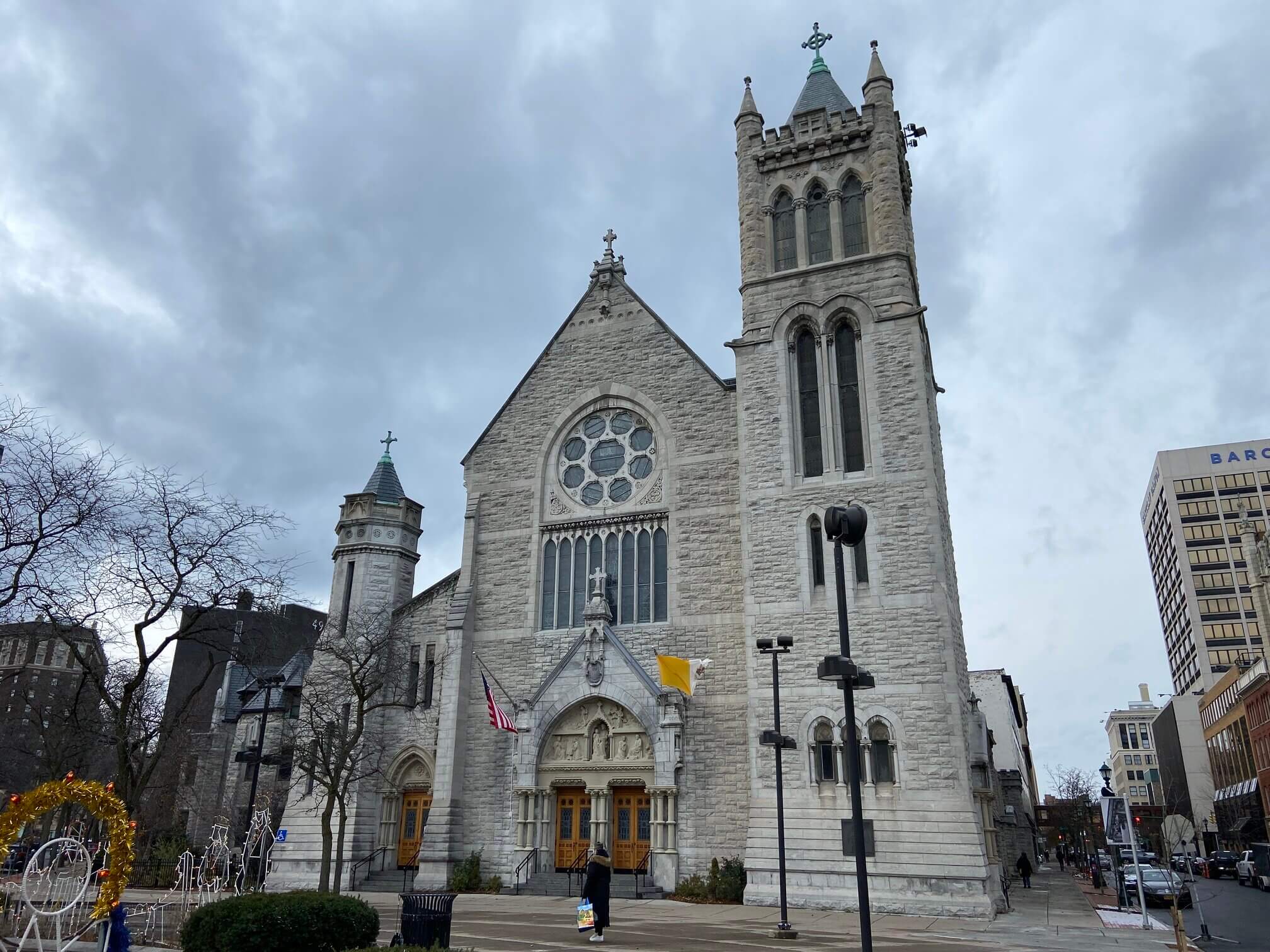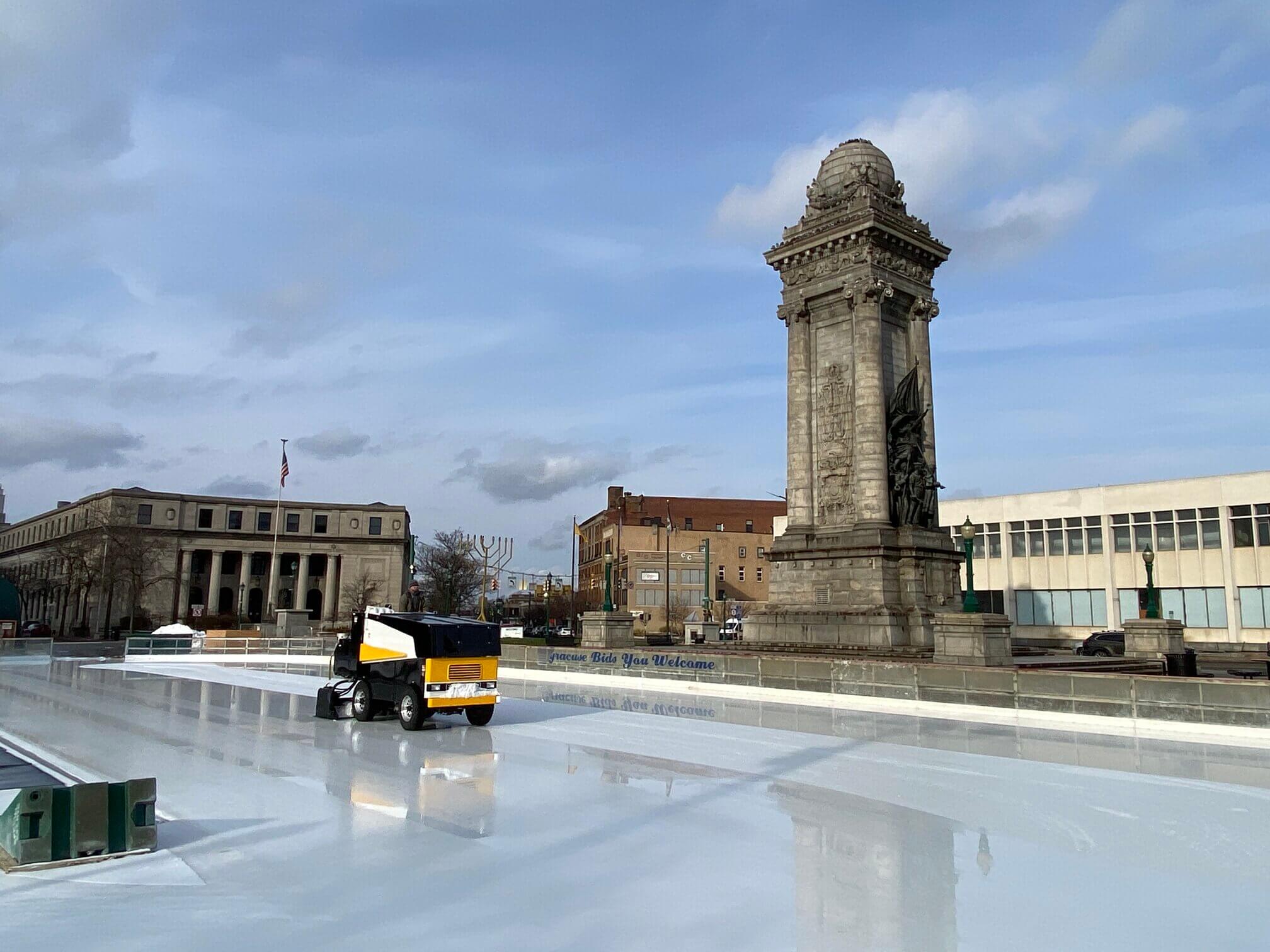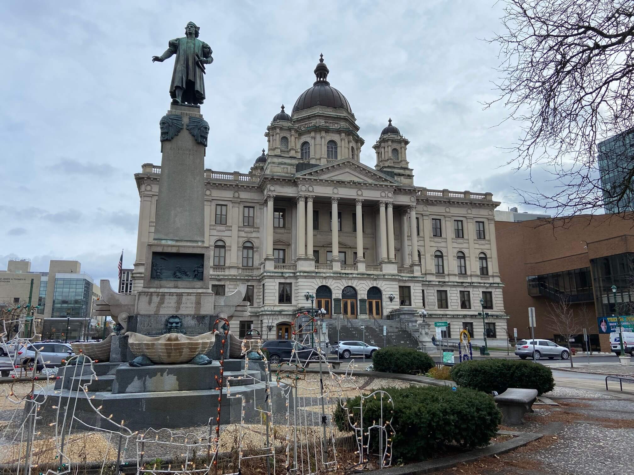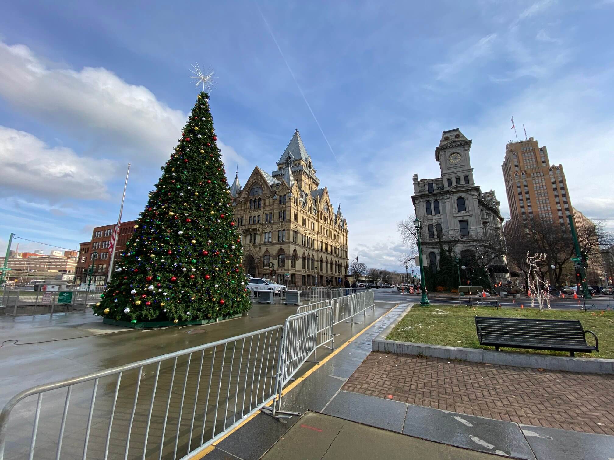 Every Christmas, a giant decorated pine tree is erected in the middle of Clinton Square and a skating rink is mowed into shape just behind it. Facing Clinton Square are three old banks buildings from the mid-nineteenth century. The road in front of Clinton Square used to be part of the Erie Canal and had five toll booths called weigh stations. The weigh stations collected so much money that banks sprung up in Syracuse to keep all the money. From left to right they are the Merchants Bank founded in 1850, Syracuse Savings Bank founded in 1848, and Onondaga Savings Bank founded in 1855.