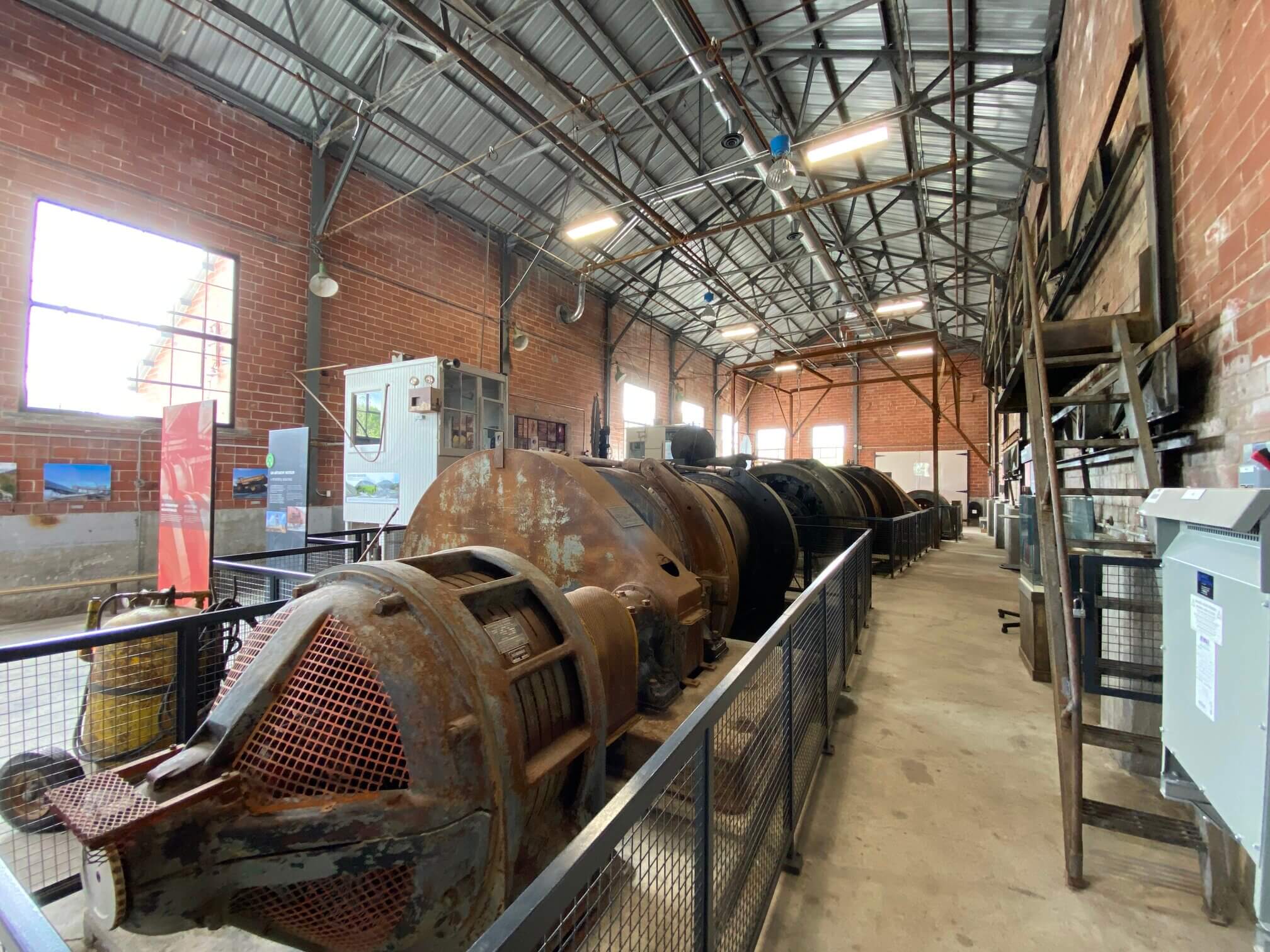 The mine shop was built in 1939 for the blacksmiths to make and repair equipment for miners and maintain other buildings. The hoist building, also built in 1939, houses electric motors that provide power to the mine elevators that transport people and ore between the tunnels and the surface.