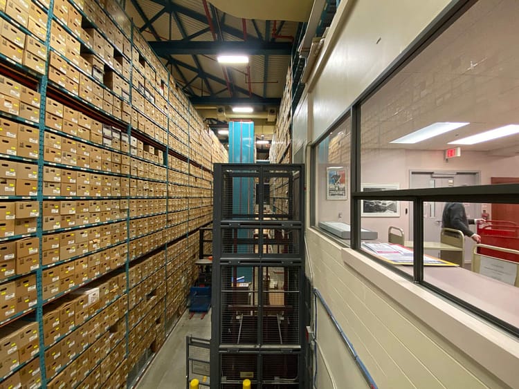 The exhibition area on the main floor changes themes every now and again. I love trains and was thrilled to see panels on the history of the Toronto Transportation Commission and the construction of subway lines. The stacks are absolutely stacked. It’s so tall that a special forklift elevator contraption is used to help archivists store and retrieve records.