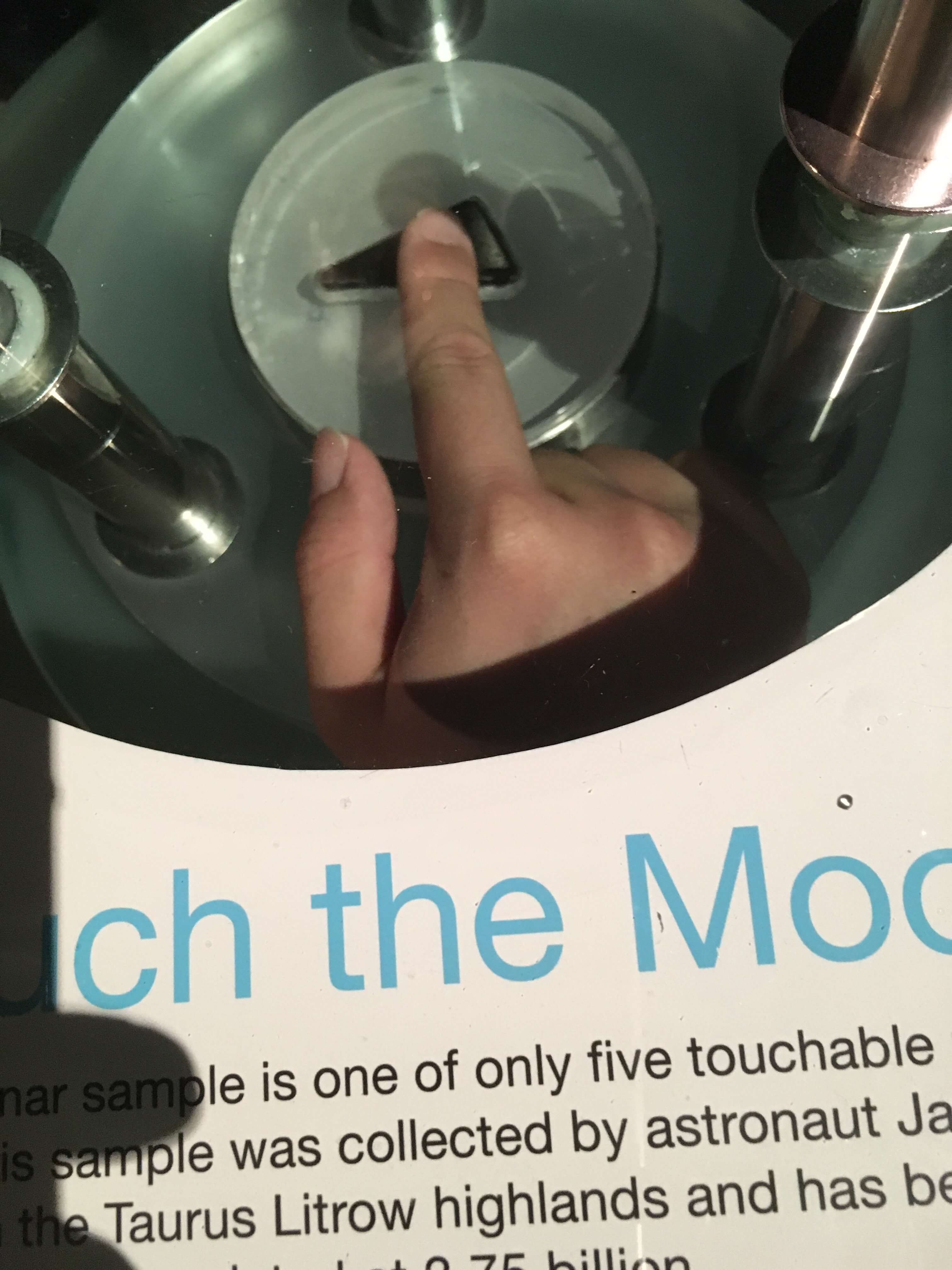 There are only five places in the world where a member of public can touch a piece of the moon recovered from one of the Apollo missions, not just from lunar meteorites. There’s one in the Johnson Space Center in Houston, Kennedy Space Center in Florida, Smithsonian Air and Space Museum in DC, Griffith Observatory in Los Angeles, and the MacMillan Space Center in Vancouver.