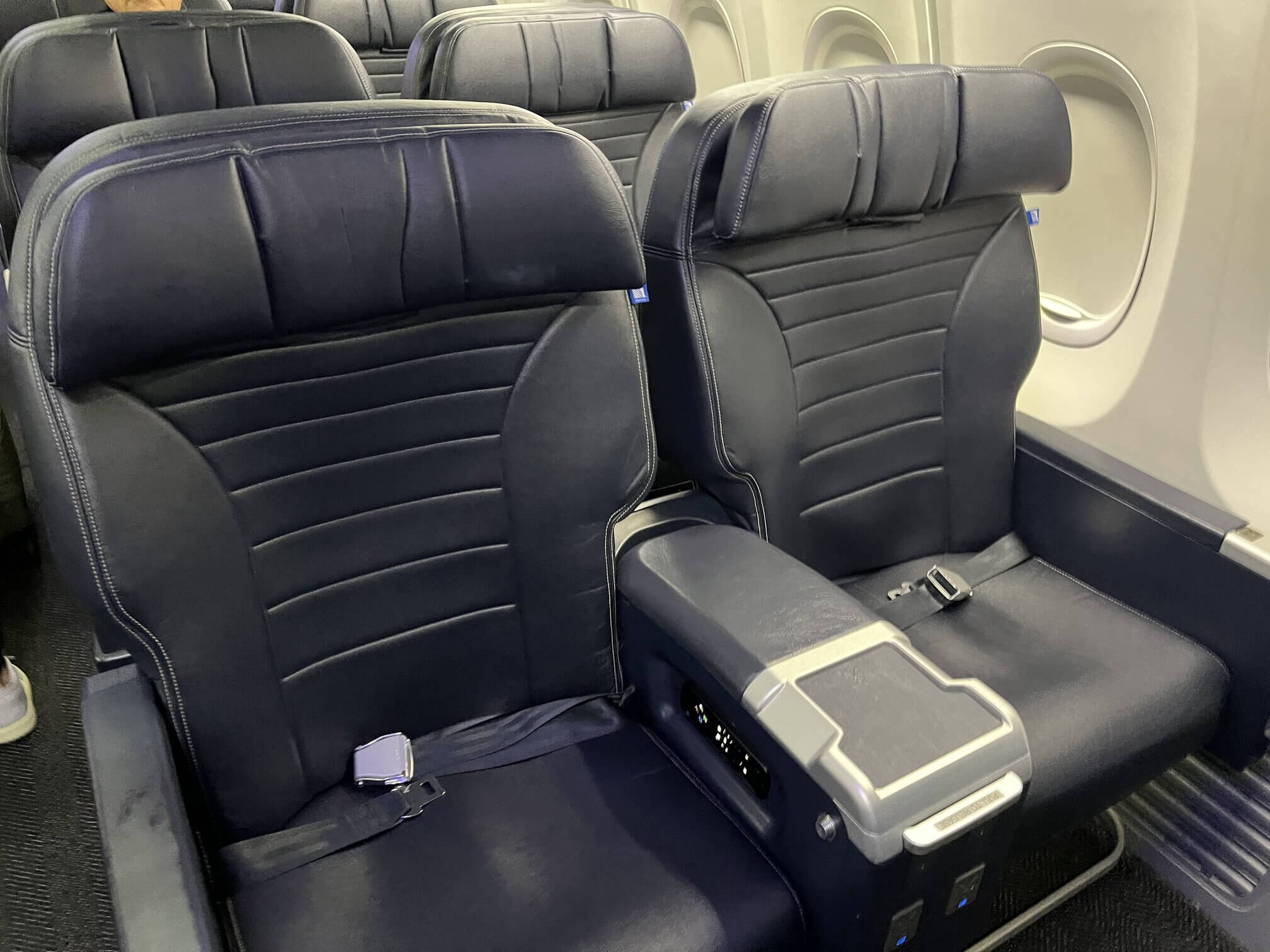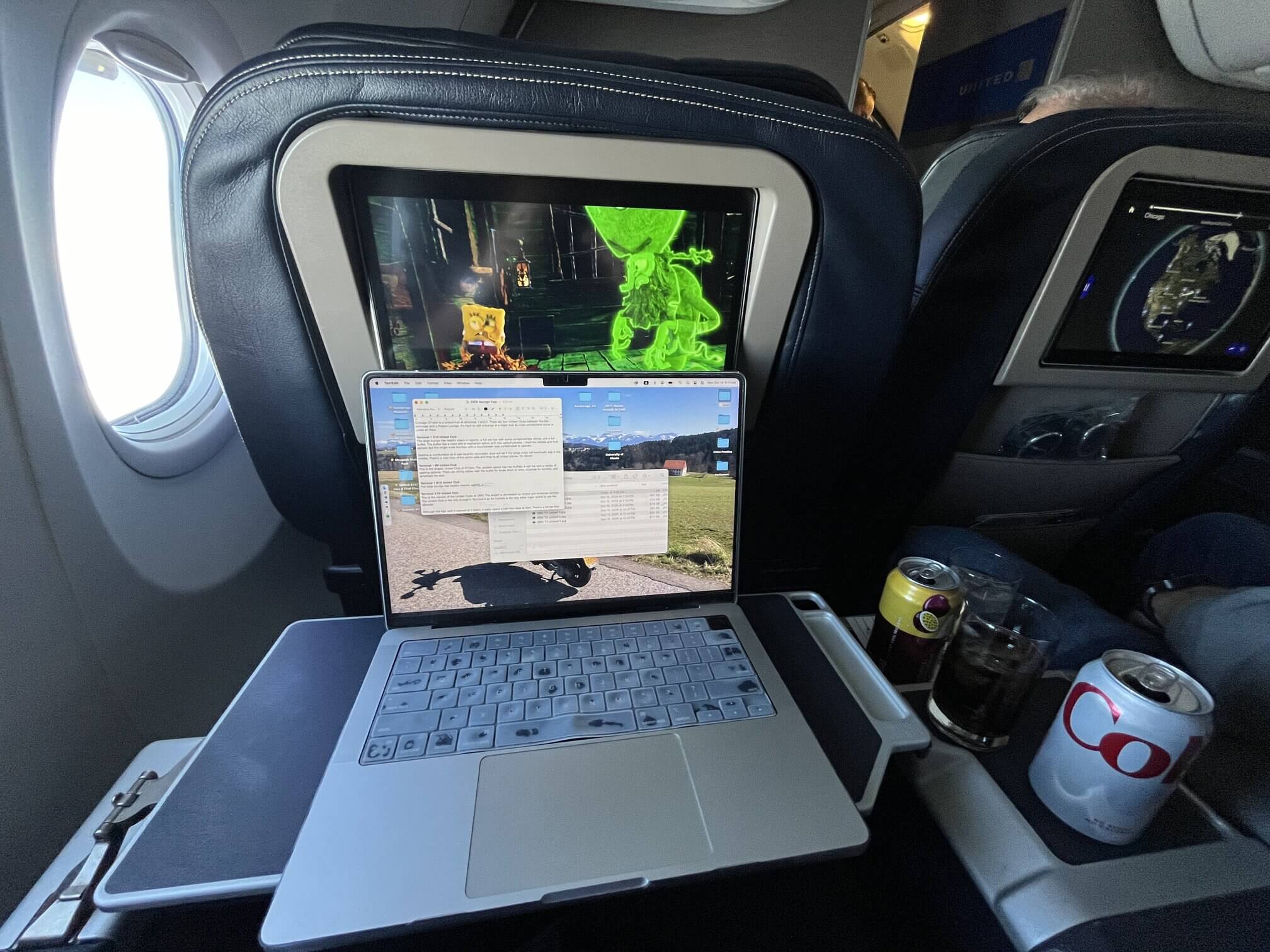 In-flight entertainment: The screen and remote control system is the same as any other contemporary United domestic first class product. I watched three episodes of SpongeBob Squarepants. Each seat has a USB-A and a three pin socket. Wi-Fi was available but it only works in U.S. and Canadian airspace for international flights in the Americas.