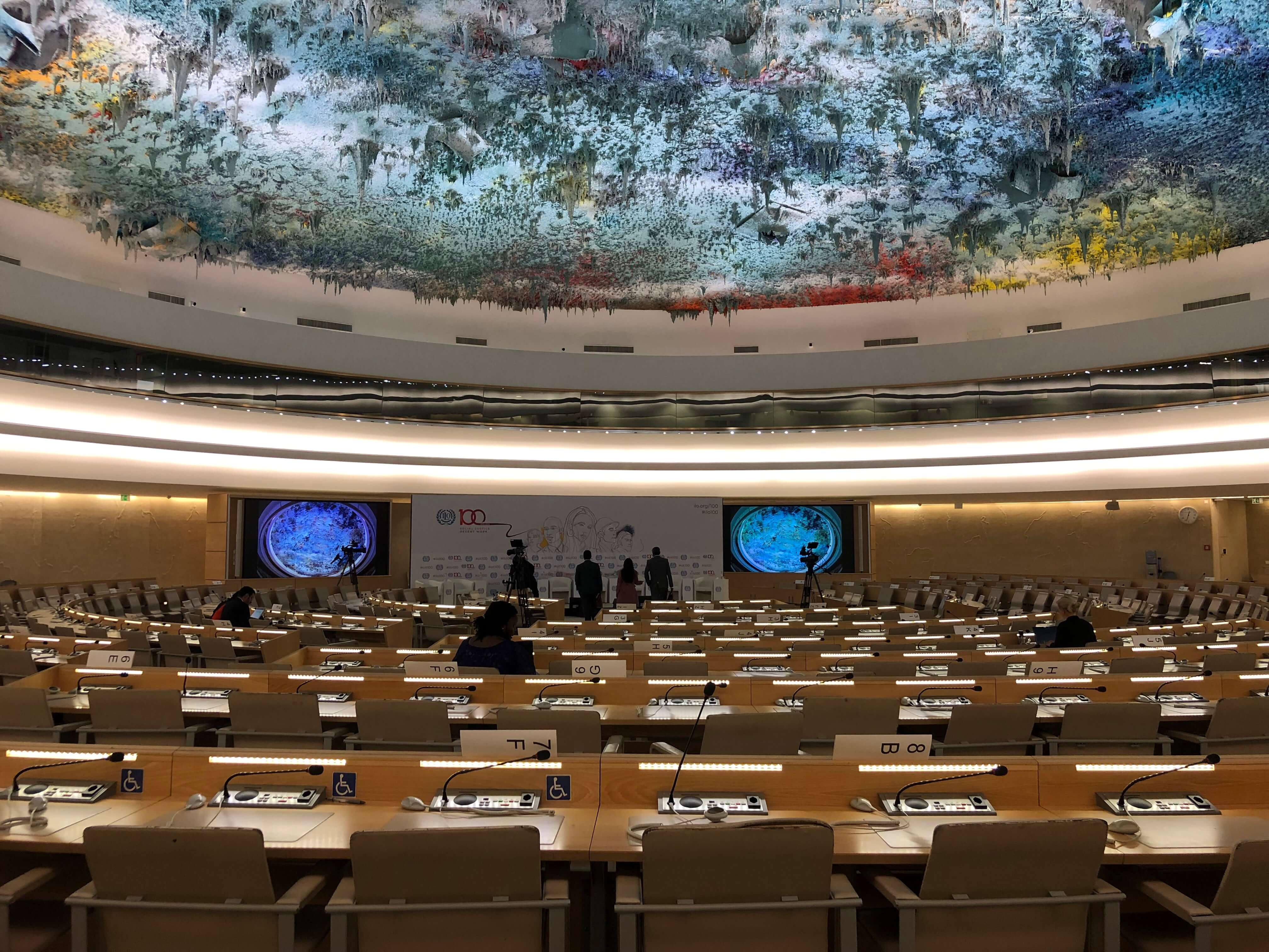 The two largest and most iconic meeting halls are rooms XIX and XX. Room XX has the famous ceiling art installation that makes the paint look as if it’s going to drip down on the delegates. I’ve also heard some people call this installation “ugly”, but to each their own opinions.