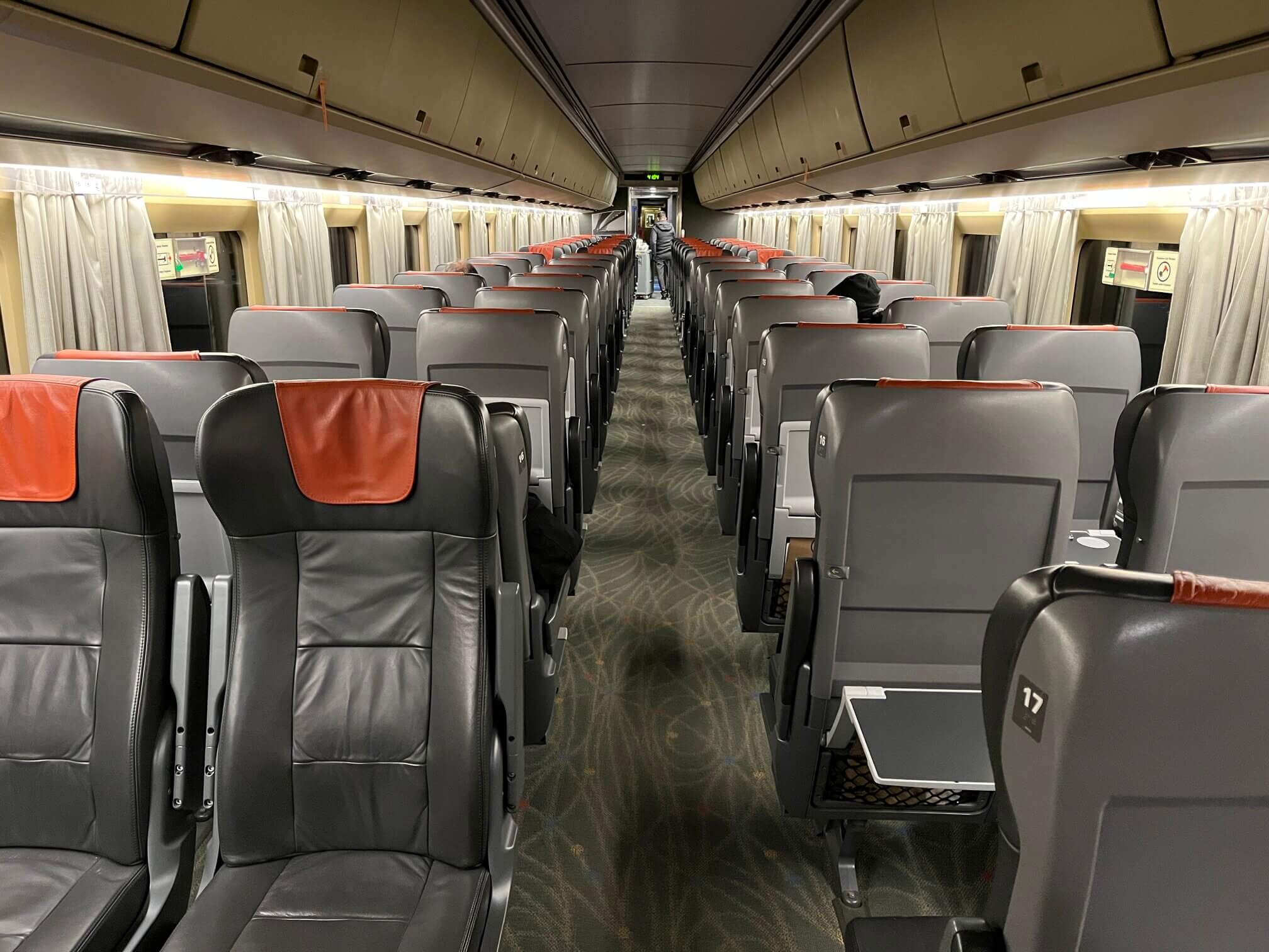 There isn’t much in the value department. There isn’t much in the comfort department either. The hard leather seats in business class remind me of the early 2000s German InterCity trains, but Via Rail showed these trains off as brand new in 2023. The tables, despite being in business class, were 10 inches away from my torso and don’t extend to reach me, failing to help facilitate business. The seats do recline, but don’t extend like they do on newer German trains to provide additional thigh support. The second-class seats don’t have coat hooks. How can a country this cold not have winter jacket storage on its trains?