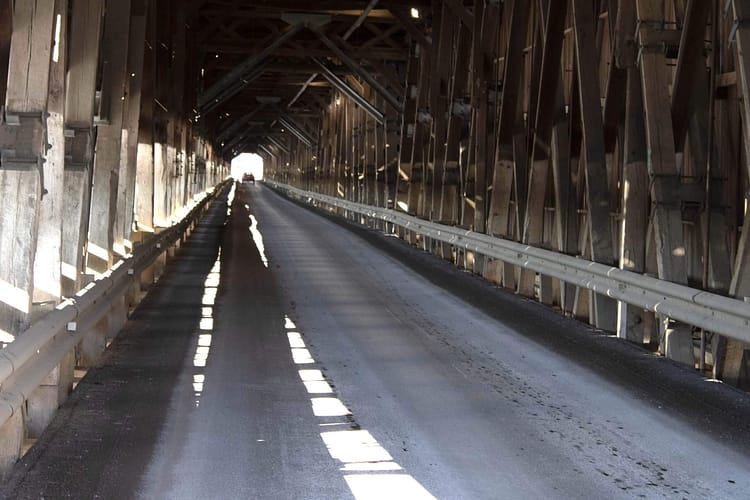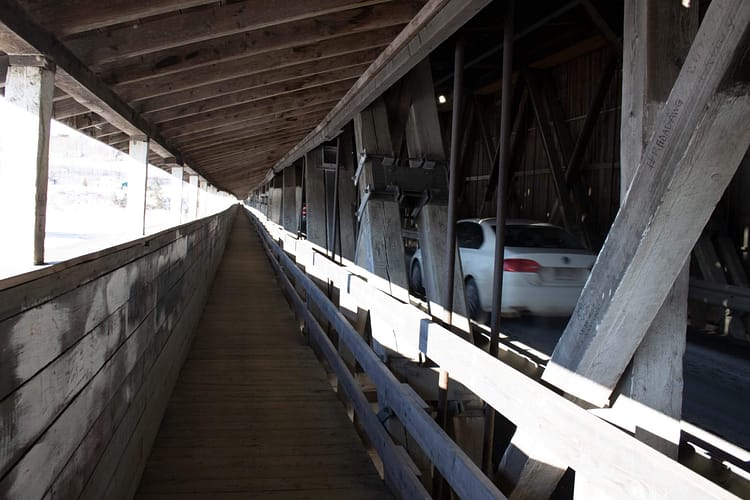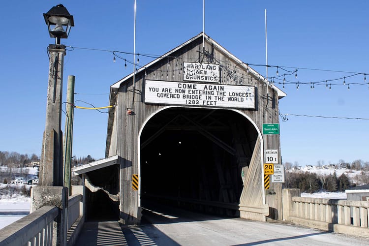 The world’s longest covered bridge is in Hartland, New Brunswick. It is 1282 feet long, or almost 400 metres long. It wasn’t covered when it was first built in 1901, it was an exposed wooden bridge set on stone-filled wooden piers. The stones came from the fields of local farmers who needed the bridge to get their crops and animals to market on the other side of the Saint John River, where the railway was located.